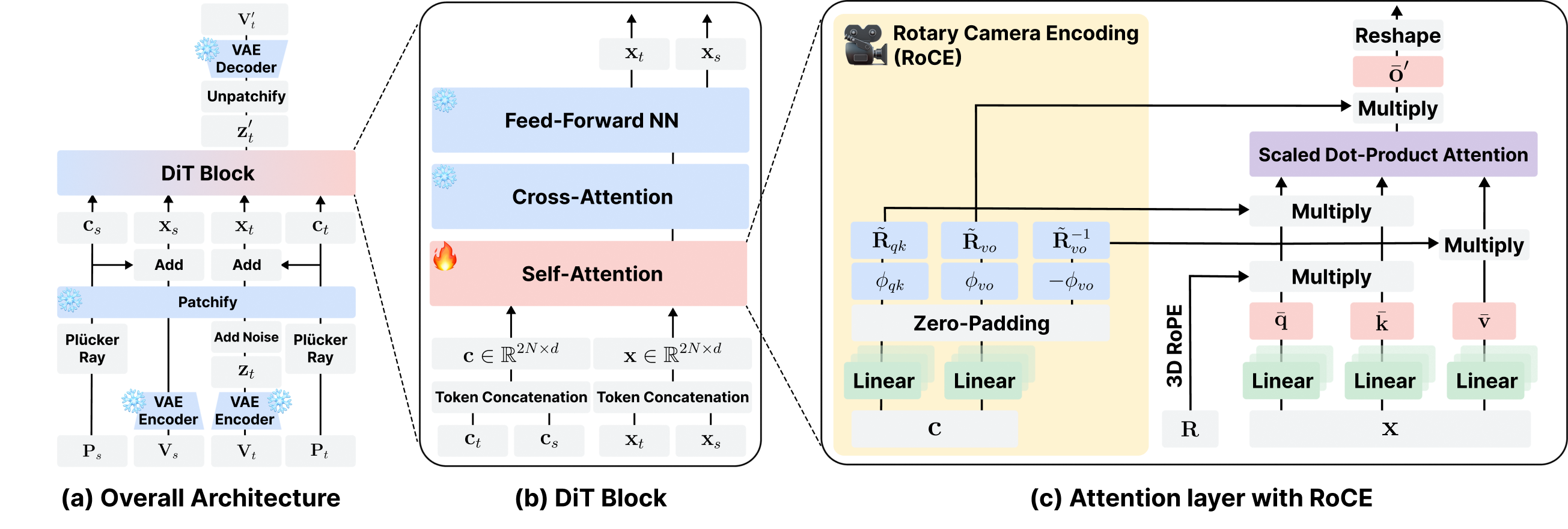 ReDirector is fine-tuned on Wan-I2V-1.3B-CamCtrl. Our goal is to generate video retakes conditioned on the target camera trajectories, the input video, and its camera poses. We introduce Rotary Camera Encoding (RoCE) into the self-attention layers, using their outputs as camera-conditioned RoPE phase shifts that provide physically grounded positional information. Finally, we employ geometry-aware attention by applying complementary phase shifts before and after value aggregation.